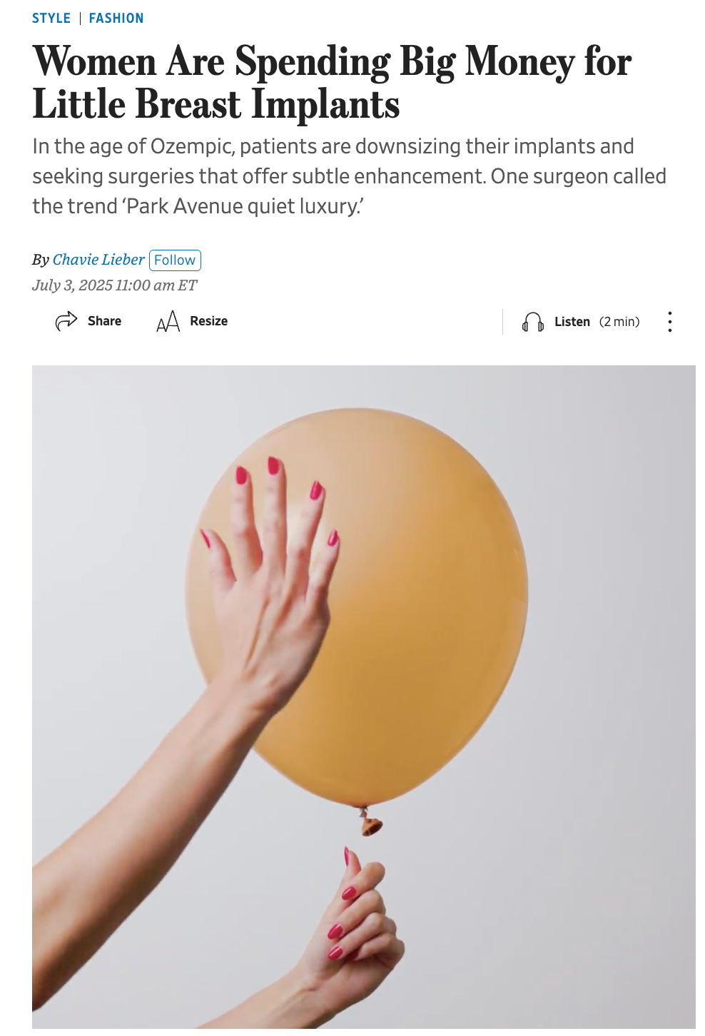 Women Are Spending Big Money for Little Breast Implants In the age of Ozempic, patients are downsizing their implants and seeking surgeries that offer subtle enhancement. One surgeon called the trend ‘Park Avenue quiet luxury.’